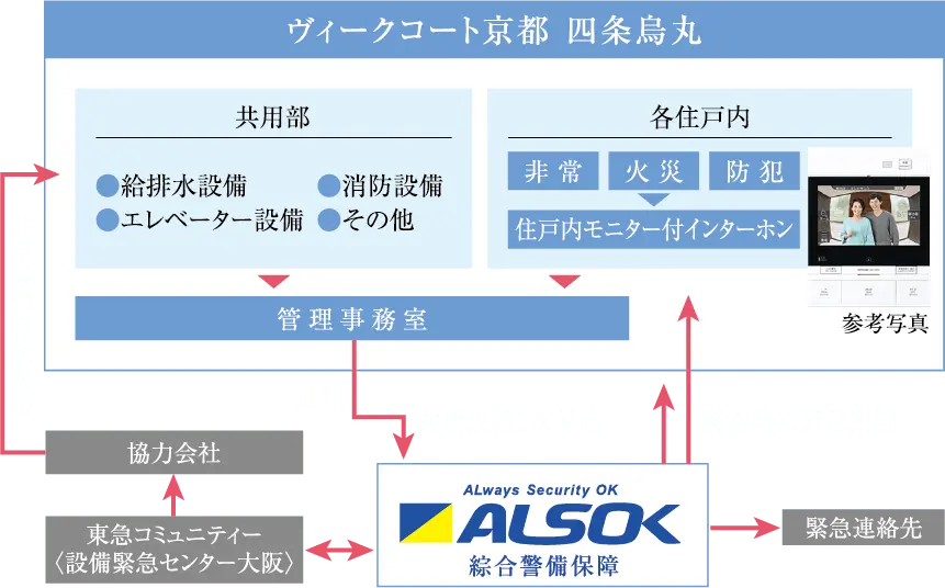 共用部や各住戸の火災(共用部は設備異常を含む)を、24時間365日体制で監視する「24時間オンラインセキュリティシステム」を採用。 非常時には異常信号が警備会社へ通報され、状況に応じて警備スタッフが対応します。