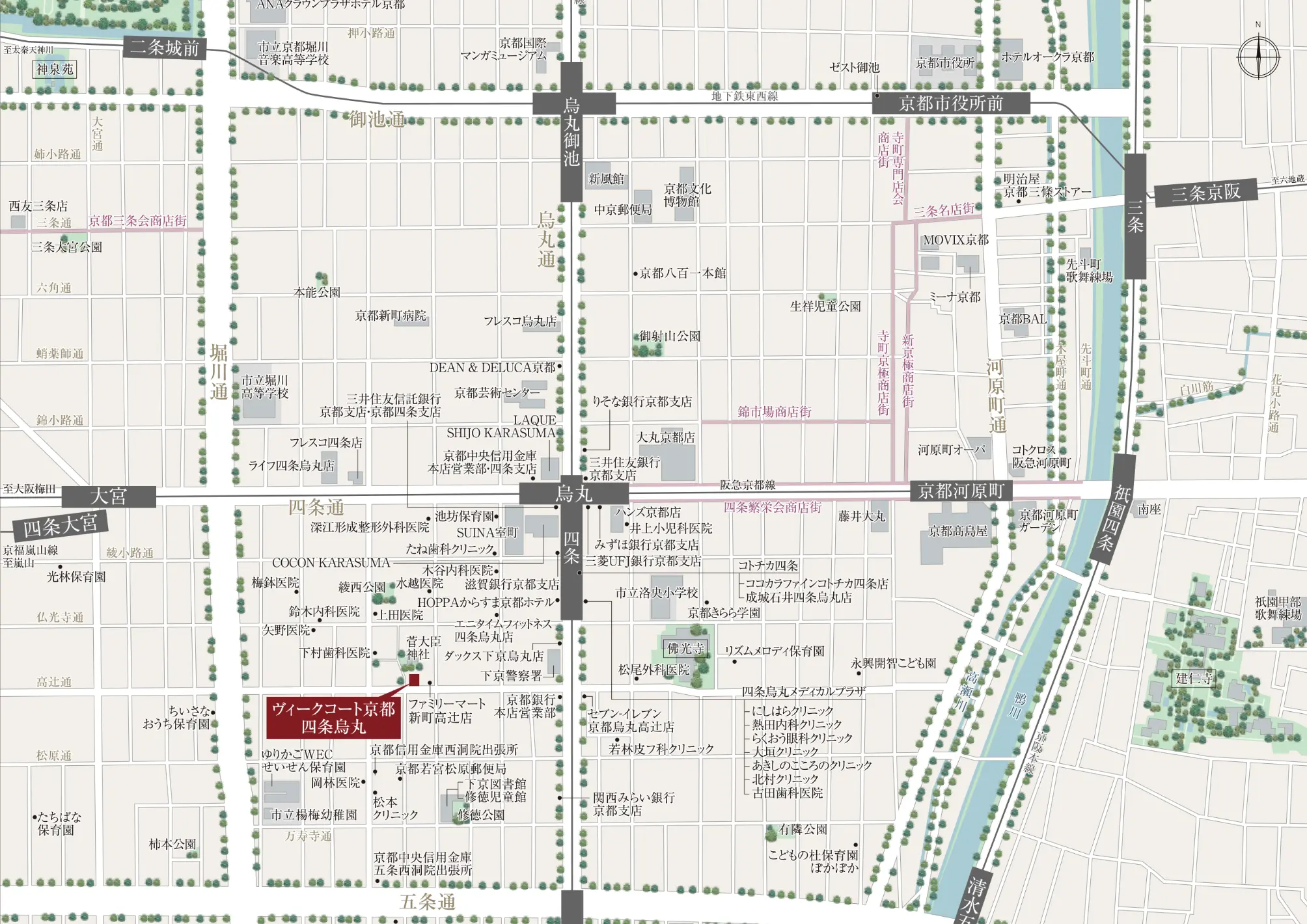 - 四条烏丸メディカルプラザ(にしはらクリニック/熱田内科クリニック/らくおう眼科クリニック/大垣クリニック/あきしのこころのクリニック/北村クリニック/古田歯科医院)徒歩7分(約520m)