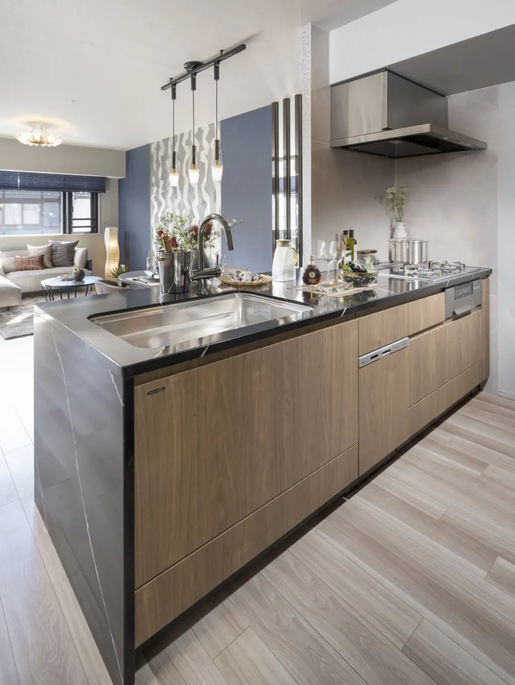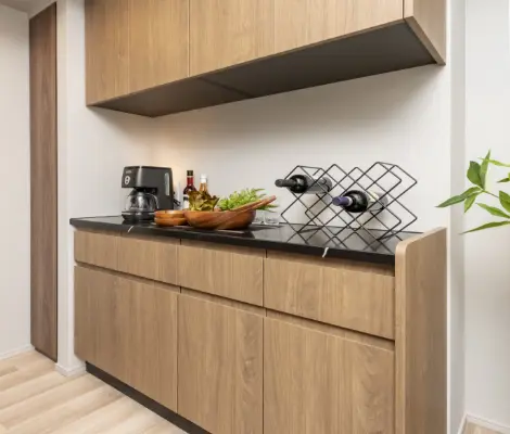 食器や調理器具の収納に便利なバックカウンターを設置。 システムキッチンに合わせたコーディネートで、美しく統一感のあるキッチン空間を演出します。