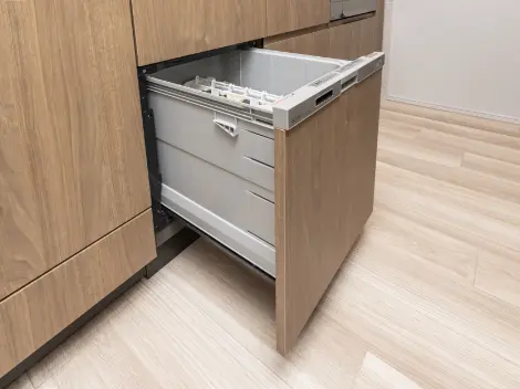 引き出し式で、洗浄と乾燥時のW除菌効果付き。 ワンタッチ操作で使いやすく節水効果と静かな運転音も魅力です。