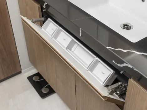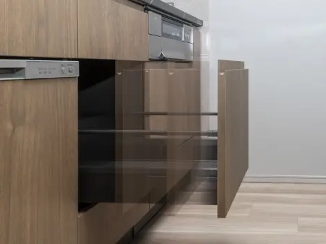 キャビネットは、強く押しても途中でスピードが落ち、吸い込まれるように静かに閉まるレールシステムを採用しています。
