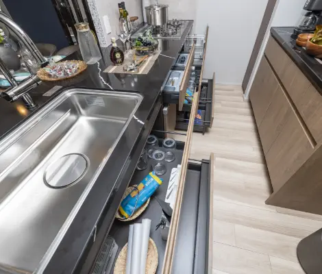 奥の調理器具まで出し入れしやすいスライド収納。 安定性のある走行で横ブレ、ガタつきもありません。