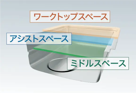 3層の立体的なシンクで「洗う」「調理」「片付」を効率的に行える静音仕様のユーティリティシンクを採用。