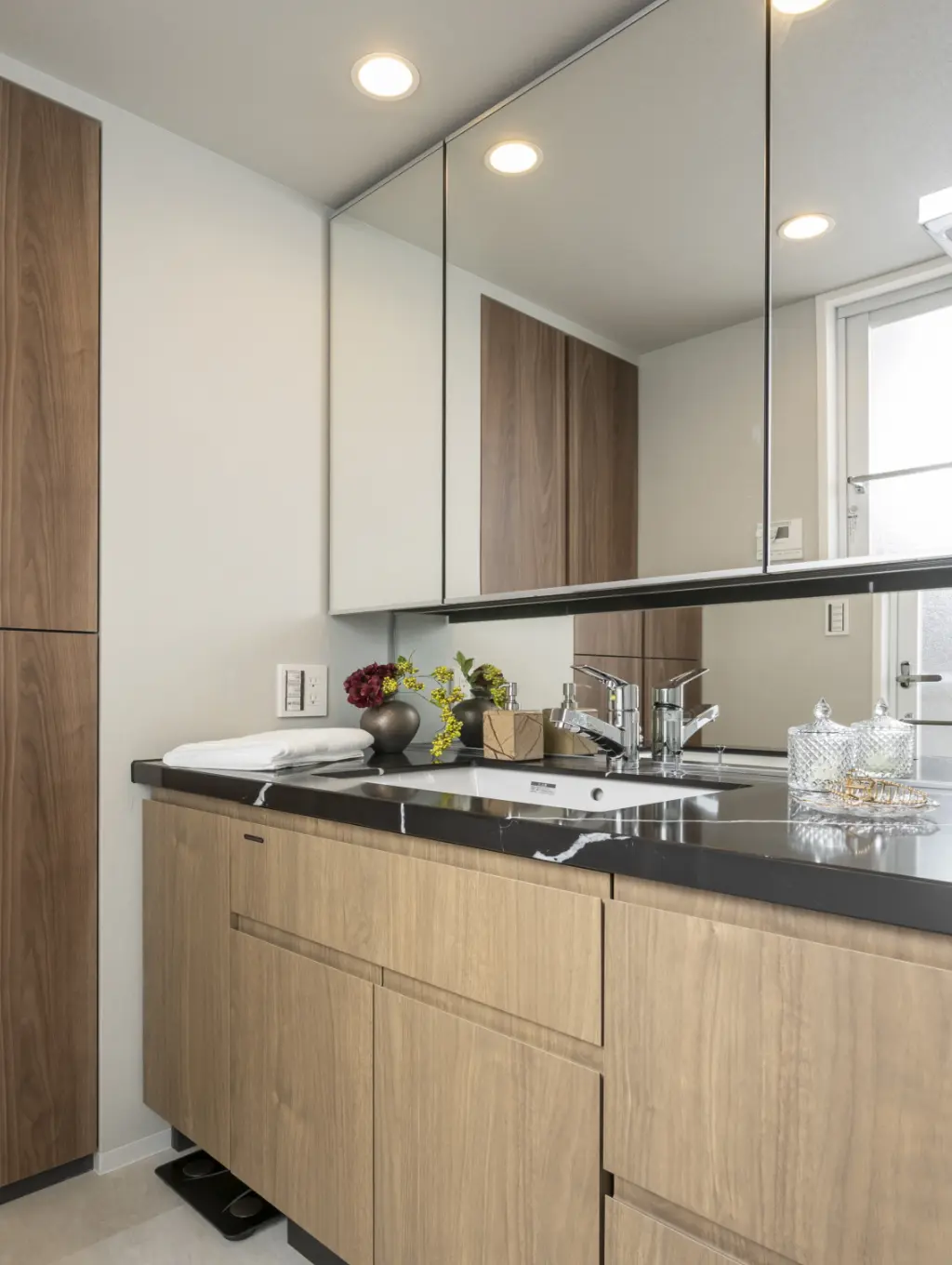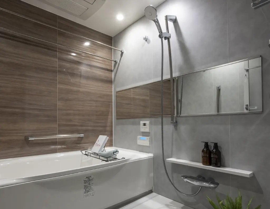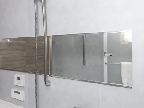 高級感のあるワイドミラーを採用。 浴室に奥行が生まれ広々とした印象を演出します。