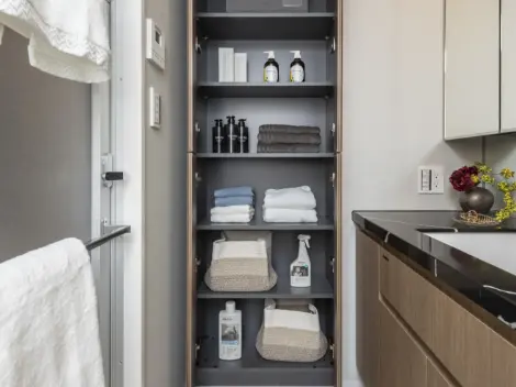水廻りの備品やタオル・バスローブ、着替えなどの収納に便利なリネン庫を設置しました。