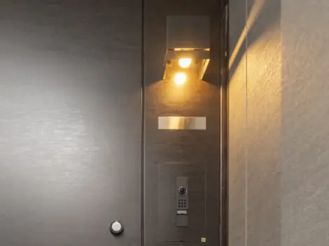 玄関ドアにはスマートにデザインされた表札やインターホン、照明をすっきりまとめたエントランスユニットを設置しています。
