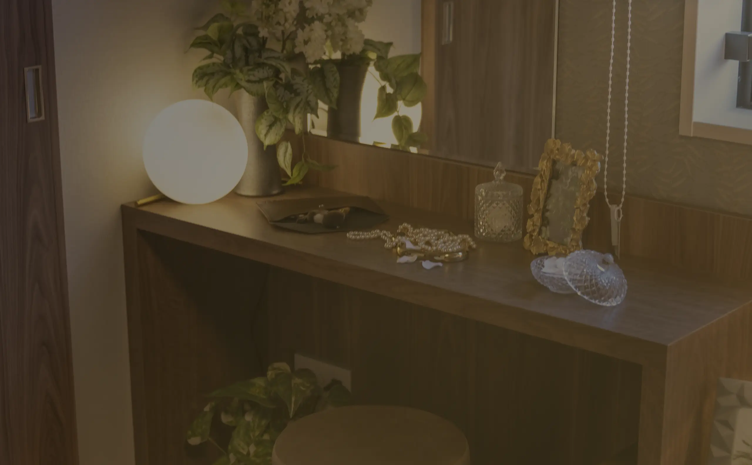 色々な角度で姿を見られるワイドな鏡は、裏側が棚になっているので化粧品や小物がすっきり収納できます。
