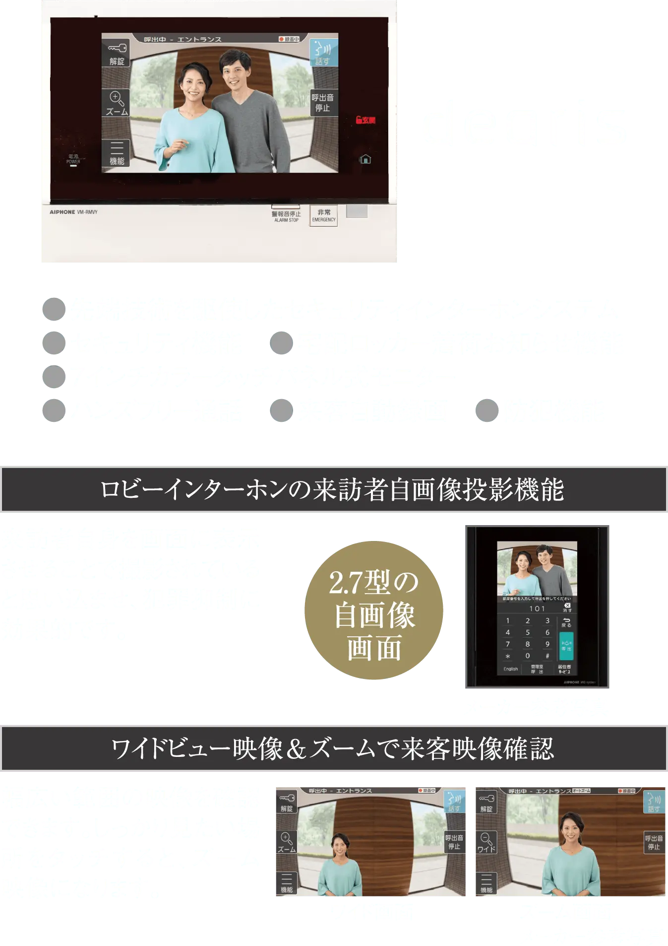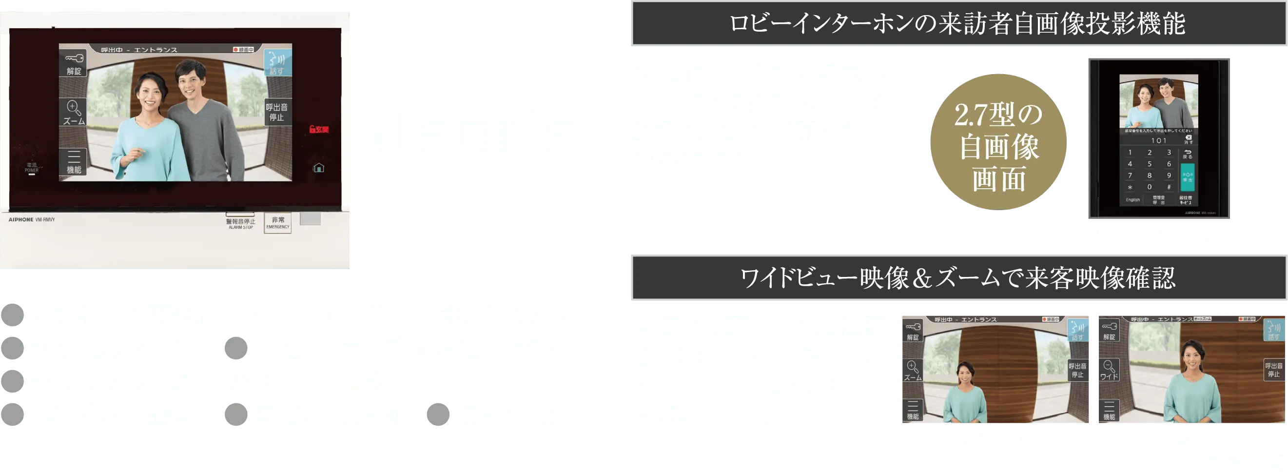 デジタルマンションインターホン「ディアリス」共用玄関と住戸玄関の2カ所で来訪者を映像と音声で確認できるカラーモニター付インターホン「ディアリス」。 録画・録音機能をはじめとする最新のセキュリティ機能が搭載されています。 また、大画面液晶タッチパネルを採用したスマートなデザインは、使いやすさも兼ね備えています。