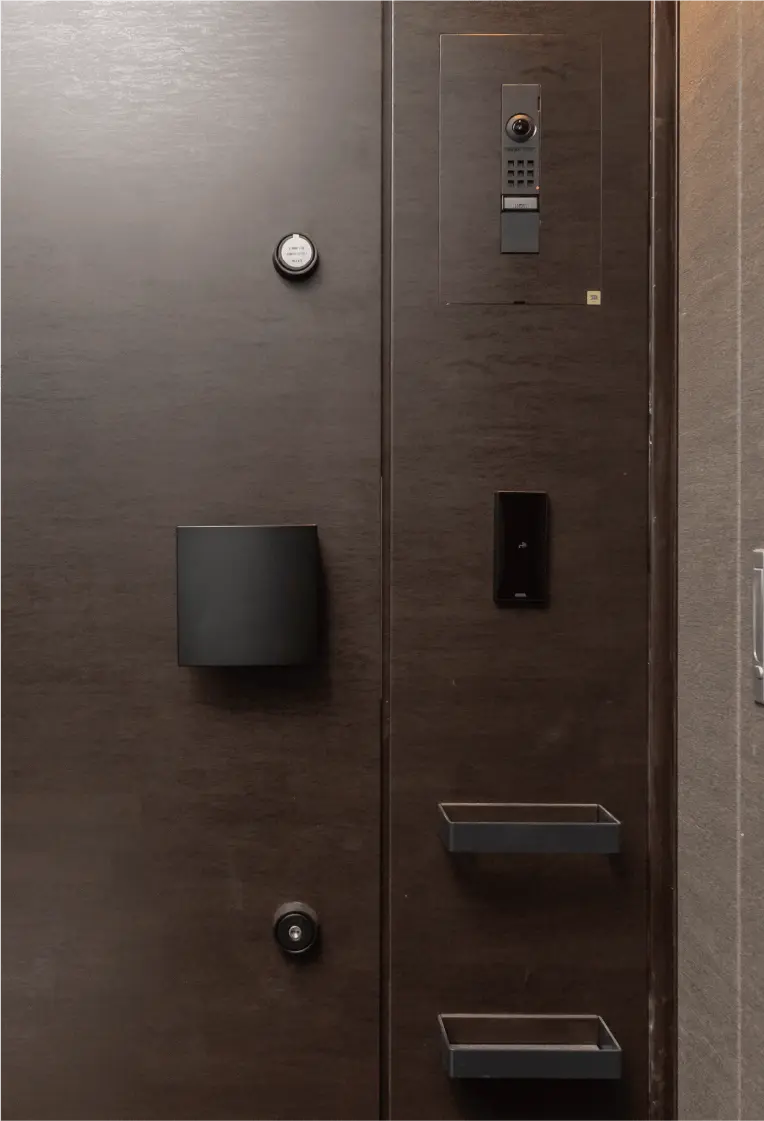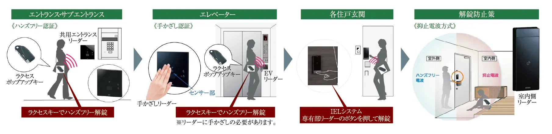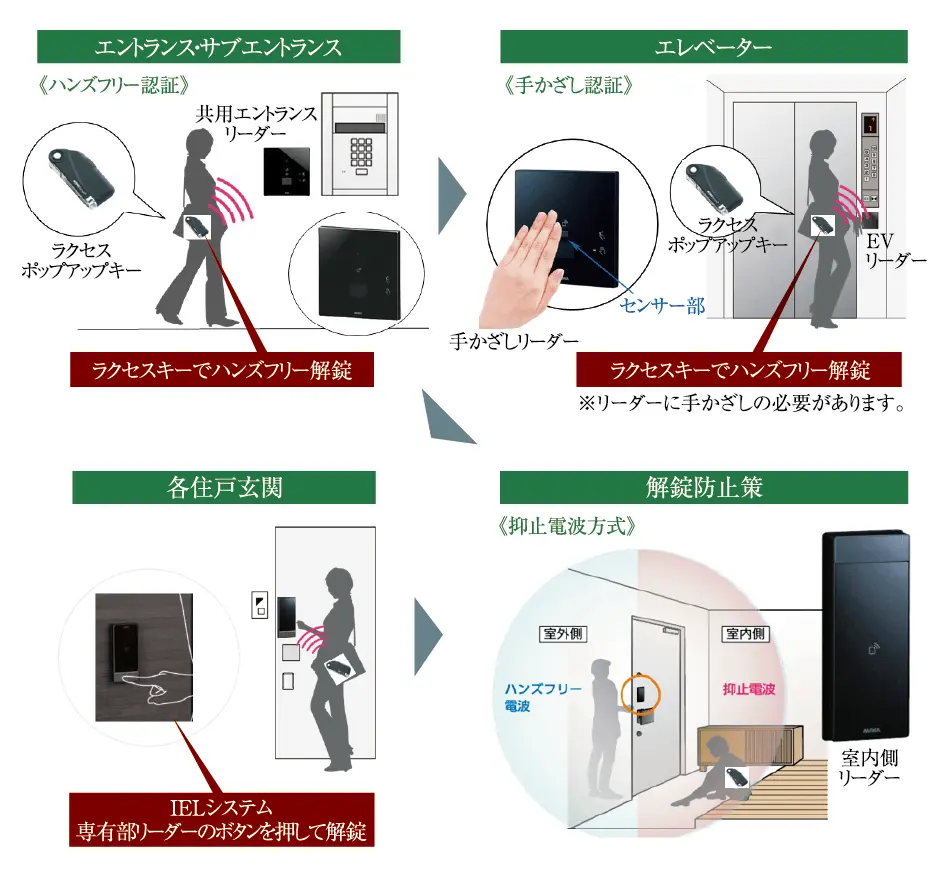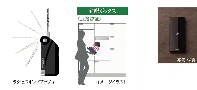 「Raccess」採用「ラクセスキー」をカバンやポケットに入れたまま住戸玄関ドアのリーダーボタンを押すだけで施錠・解錠が可能な「IELシステム」を採用。 また1階のエントランスやエレベータードア、さらに駐輪場もキーを取り出すことなくハンズフリーで、セキュリティを解錠する事ができます。